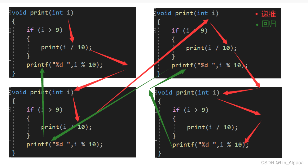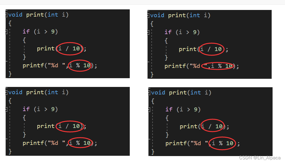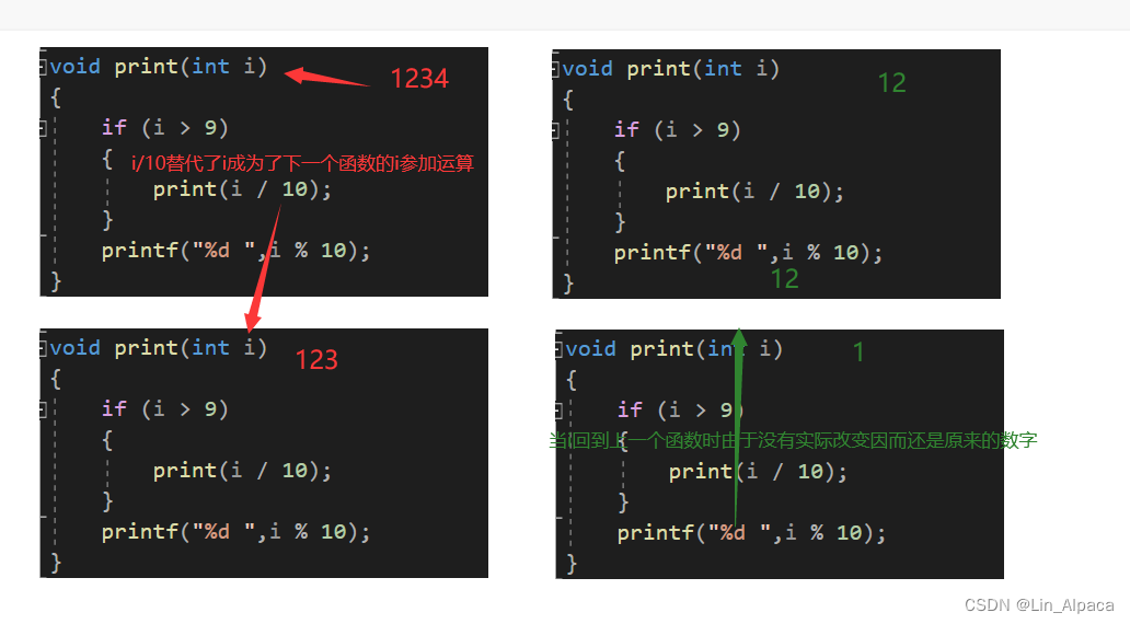 对于i的处理都是在运算符和函数之中进行的,并没有对形参进行实际的修改,让i/10进入下一函数进行运算,让i%10进行打印,整个函数能正确运行都是建立在 i 在各个函数之中都还是他各自的值的基础上。因此在自己写代码的时候必须仔细注意这个小细节,千万不能再设置一个新变量后对 i 直接进行处理。