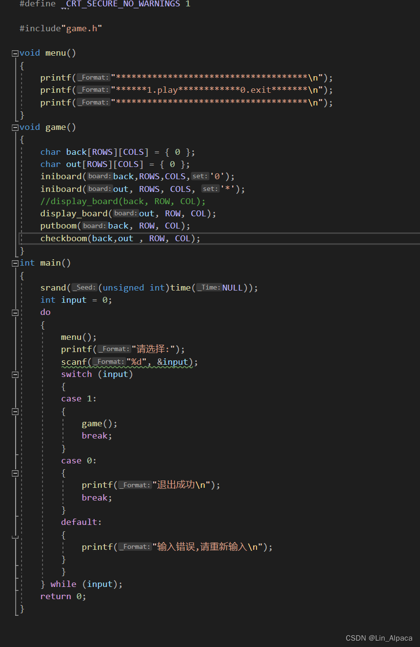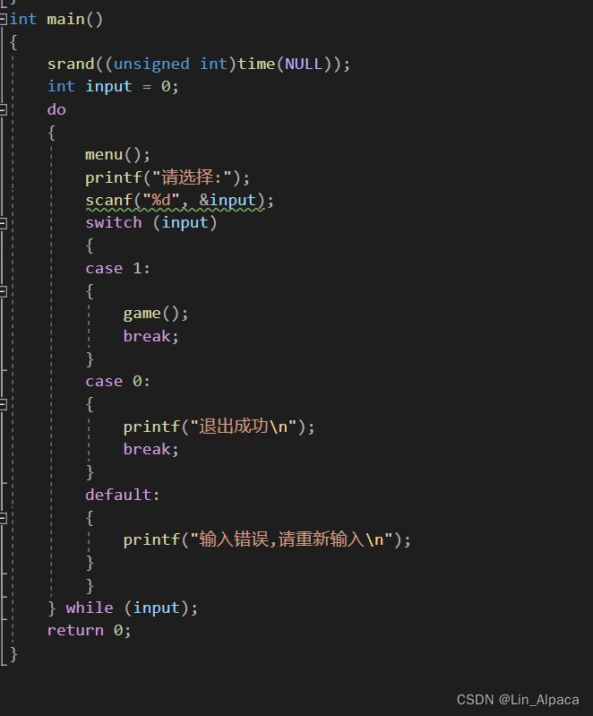 一样,怎么好看怎么来,为了我们玩完一把之后还能再玩下去,do while循环就是因此而存在的,因其特性可以至少运行一次,然后我们再使用input作为参数当input为0时循环结束。同样我们这次也是要使用随机值来布雷,因而要在主函数中对rand用时间戳进行定义。然后用switch来进行选择,根据input的不同语句的入口也不一样,使用break 将各各区域分隔开,避免走入其他语句之中。