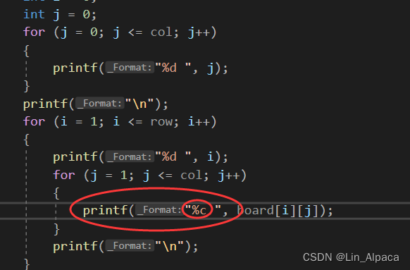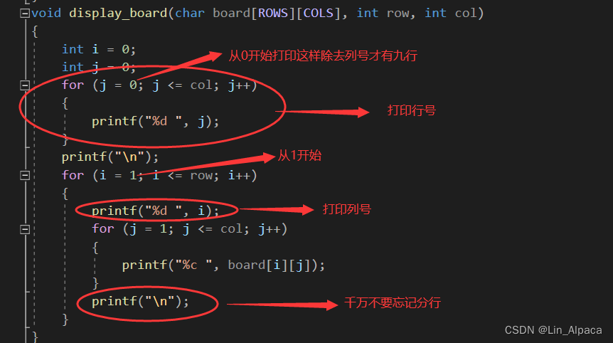 如果只是普通的把数组打印出来的话,只需要两个for循环全选然后一个一个打印就可以了,但是我们想在标头加上行号和列号的话,就要加上一些修饰。需要在两个for循环前在加上一个循环用于打印列号,在每一列的打印中加上行号的打印。并且要打印的是9X9的游戏界面,所以用的row和col也是9而不是11。