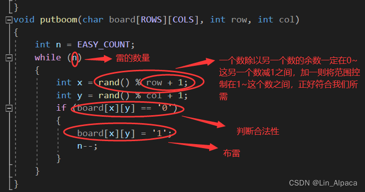 一次游戏,一共有row X col的格子扣掉地雷的数量便得到了一共需要排雷几次,将参数带入循环,则成为了游戏结束的凭据。