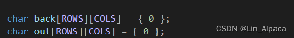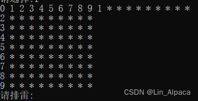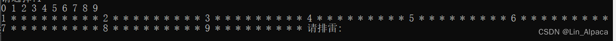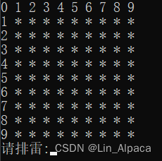 此时我们的界面还是空的,现在要对这个数组进行初始化,我们需要传四个参数,各个数组、行数、列数、初始化所定义的字符,我们这里将内数组 雷定义为1非雷定义为0,将外数组全定义为 * 号打印出来作为我们的游戏界面。