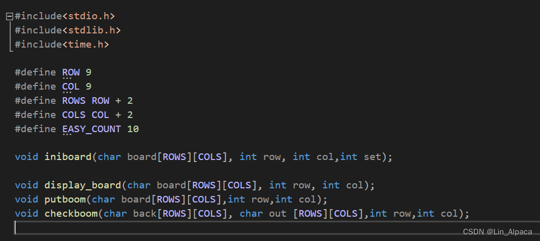 只需要根据设置雷的数量生成该数量的随机数,并检测其合法性之后将其放置在内侧的数组之中,就是这个常量的设置,在头文件中要用大写来定义,害我写的时候老是报错。