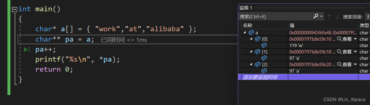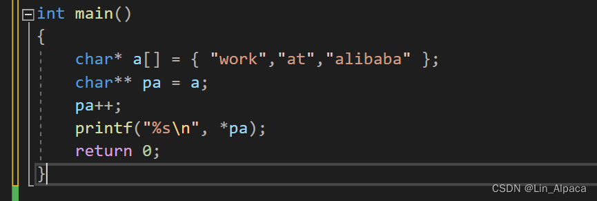 而 pa 是一个二级指针存放数组 a 的地址虽然定义得不够稳妥但是还是可以使用,pa++ 后便由原来指向 w 转为指向 a 了。随后打印字符串,即到 \0 截止。所以最后打印的结果便是 at 。