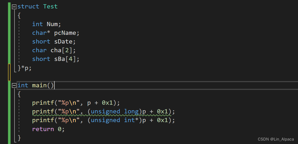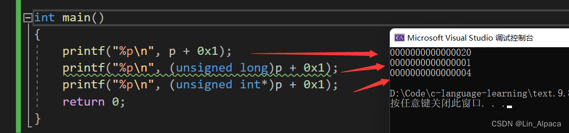 我们来看这串代码,首先定义了一个结构体指针(大小为20字节);第一个打印的是 p 直接加上一个 1 ,p为结构型指针所以加上 1 时地址会加上一个结构体指针类型大小,而当 p 被强制类型转换成 long 由于long为整型所以,整型之间的加减便是直接相加,即加一。当被转化成 int* 的时候就是加上一个 int* 类型的大小。便是如下结果。