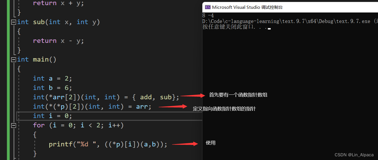 既然有了函数指针数组自然有指向函数指针数组的指针。
