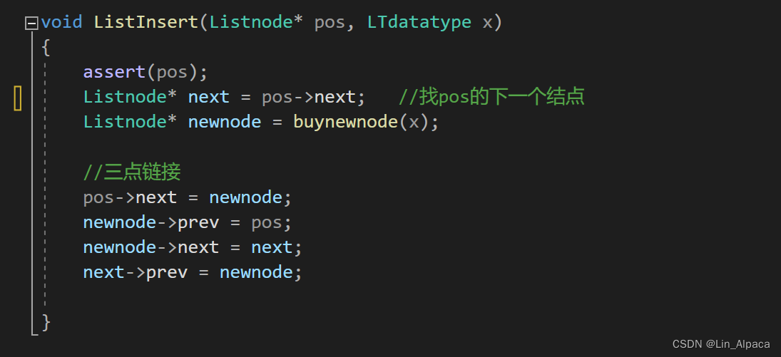 接收一个结点的地址,操作前先判断是否是空指针避免发生错误,因为要在 pos 的下一位插入结点,所以找到 pos 的下一位,新建结点后将其插入到二者之间。若要在 pos 前插入只要 pos 的上一个结点就可以了,这也是单链表十分困难才能做到的操作。