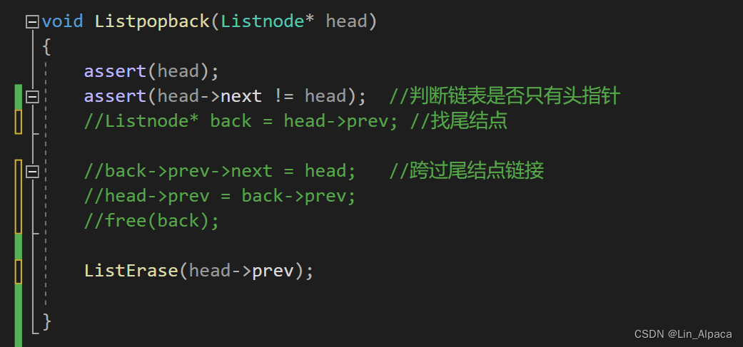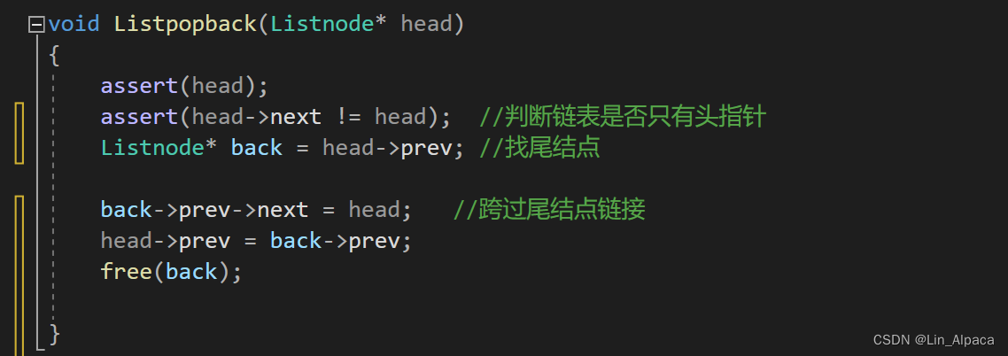 经过结构的升级,原本单链表原本不完善的结构已经完善,尾删一样变得非常简单通过头结点找到尾结点,再寻找到尾结点的上一个结点并将其于头结点链接起来就可以实现。