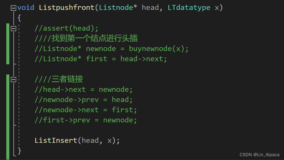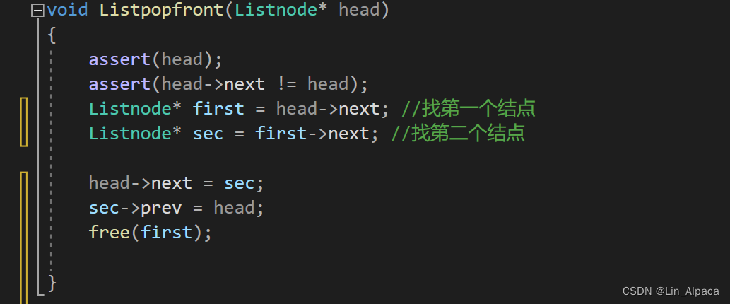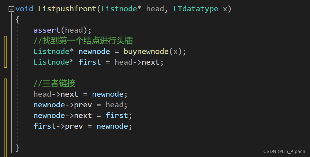 头插跟尾插的步骤相差不大,先断言传入的指针,之后需要找到第一个结点,在其于头结点之间插入新节点。