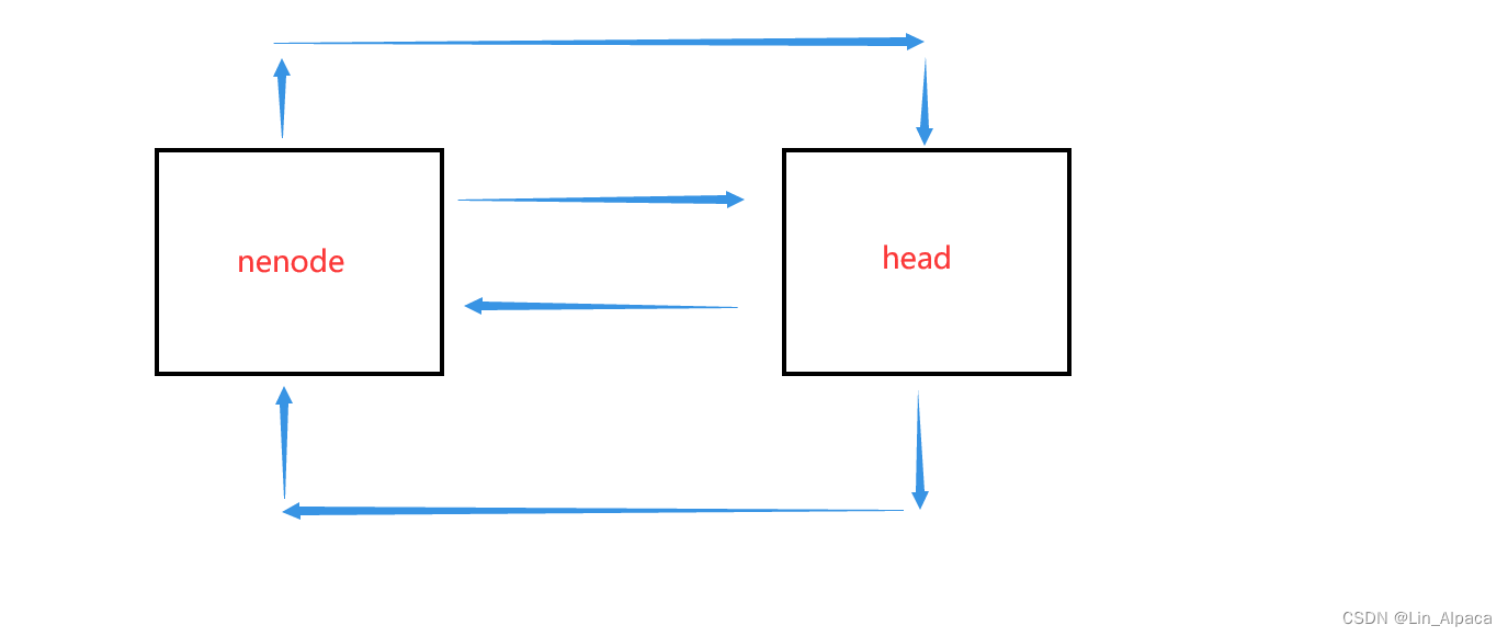 书接上文,想象一下当我们链表中只有一个头结点时,对头结点的上一个结点访问仍然还是头结点,之后头结点的上一个结点为新的这个结点,由于在这之前头结点的上一个结点还是自己,经过链接头结点上一个跟下一个都是新结点,就相当于是头插,这就是前面头结点初始化时要让头结点的上下结点都指向自己的原因。