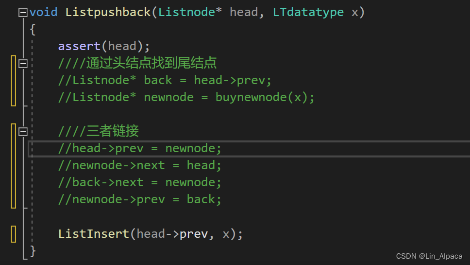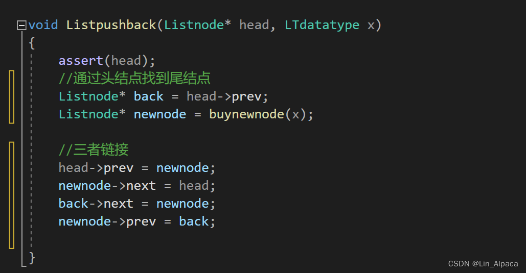 这边就可以直接感受到这个结构给我们带来的便利,我们只需对头结点进行断言之后通过头结点找到尾节点,并在二者之间插入新节点。值得注意的是,尾插是在尾结点跟头结点之间插入,而不是在尾结点前插入,要避免出现这样的误区。