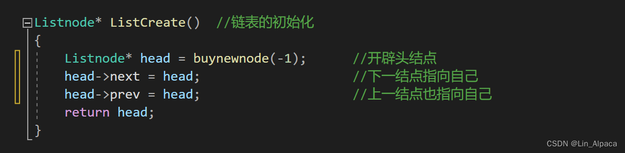 这是个带头的链表,所以在初始化的时候就要完成头结点的开辟,完成初步的循环。