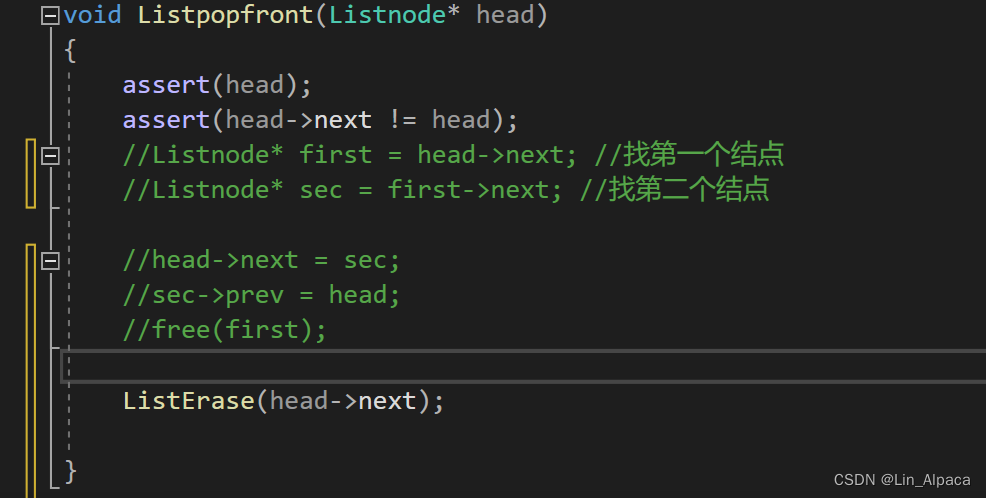 接收一个指针,判断一下删除两件套(传入指针是否为空及链表是否只有一个头结点),然后找到 pos 的前后结点将其链接起来后并将 pos 释放就完成目标。即便只有一个结点也能完成工作。