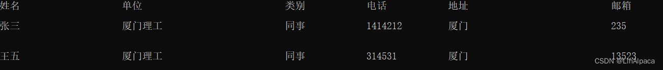 printf("%-20s\t%-30s\t%-10s\t%-12s\t%-30s\t%-30s\n", "姓名", "单位", "类别", "电话", "地址", "邮箱");