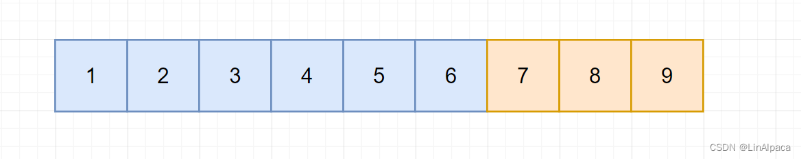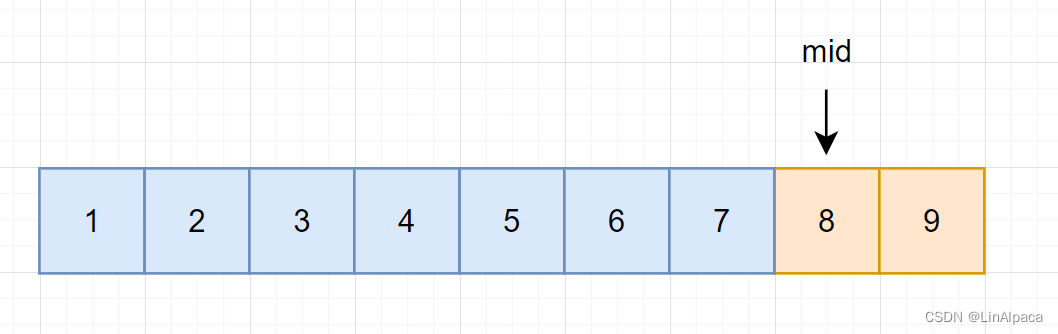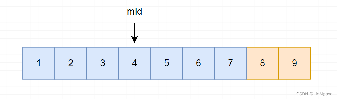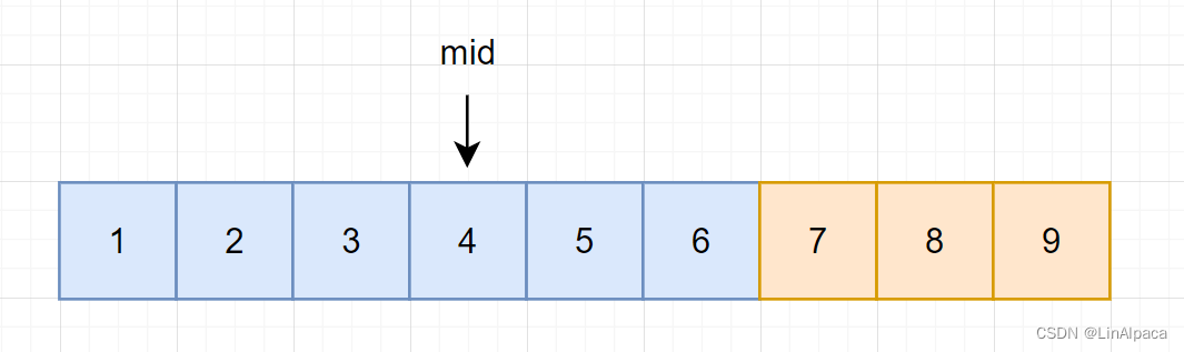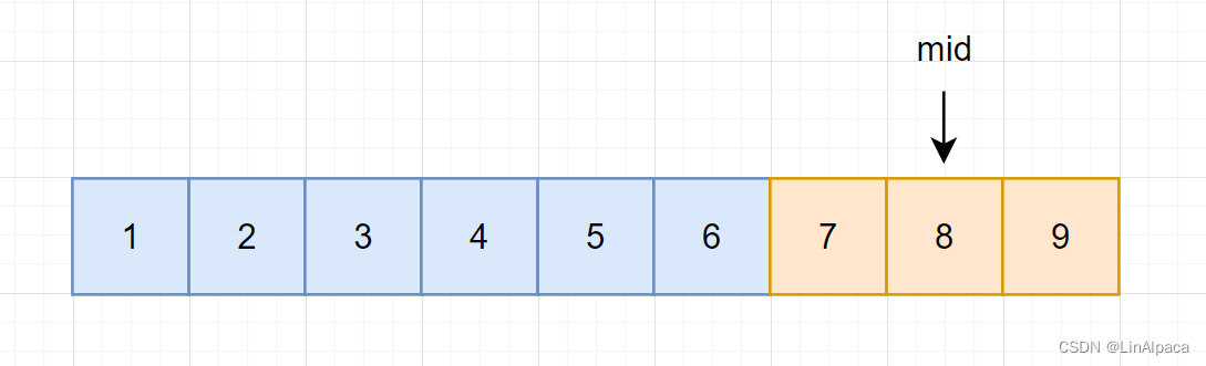 🥥假设当前我们有一个 1~9 的有序数组,现在我们要查找数组中的7。由此我们可以通过数字的大小将其分为小于 7 和 大于等于 7 的两个部分。