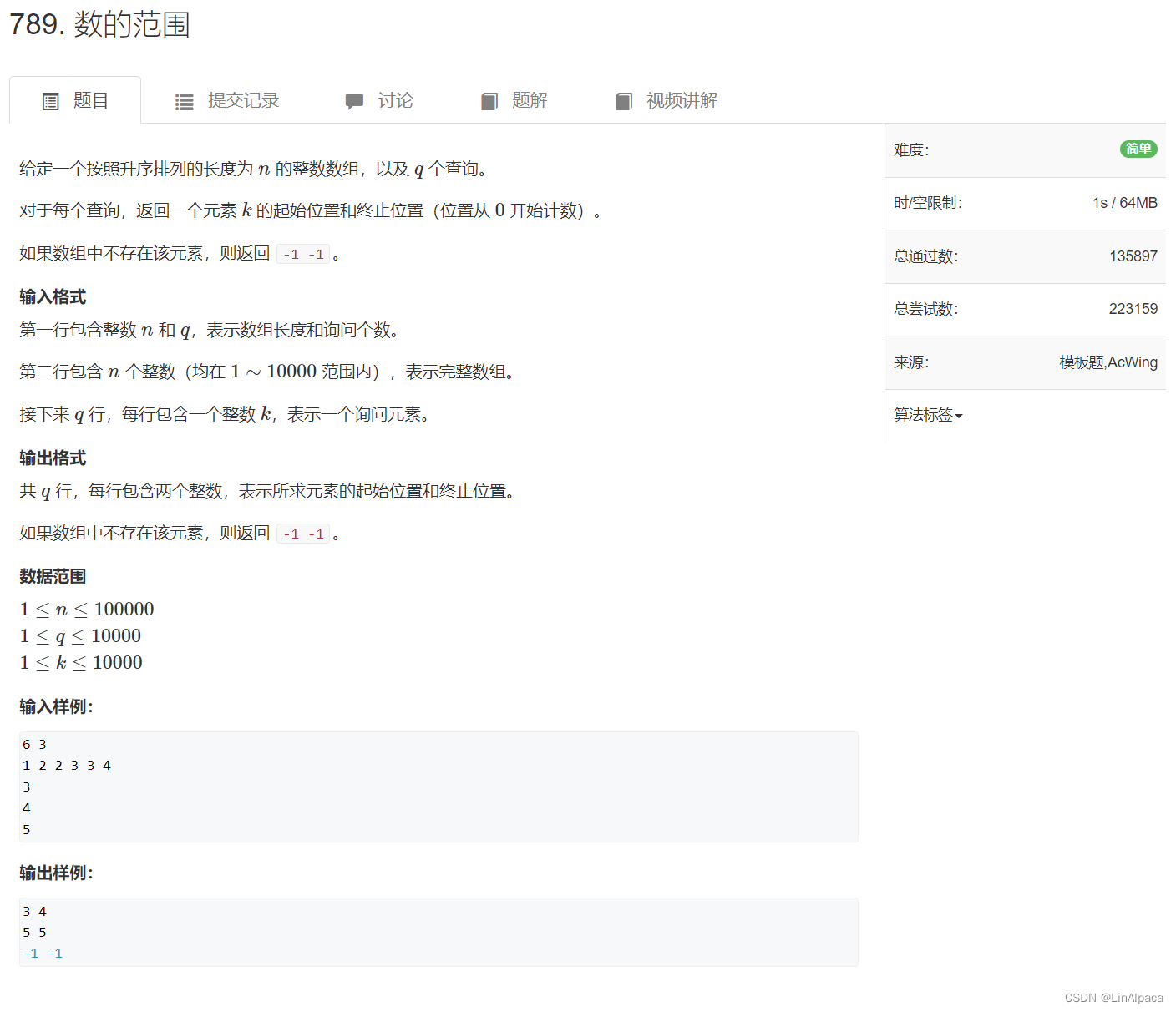 🥥即经过两次二分,分别查找左边界及右边界(若只有一个数则左右边界相等),查找一个边界后我们还可以进行一次特判,若当前端点并非我们要求的目标值,则说明这个数组之中并没有我们想要的值,因此便可以直接输出 -1 ,否则就再继续查找另一端点。