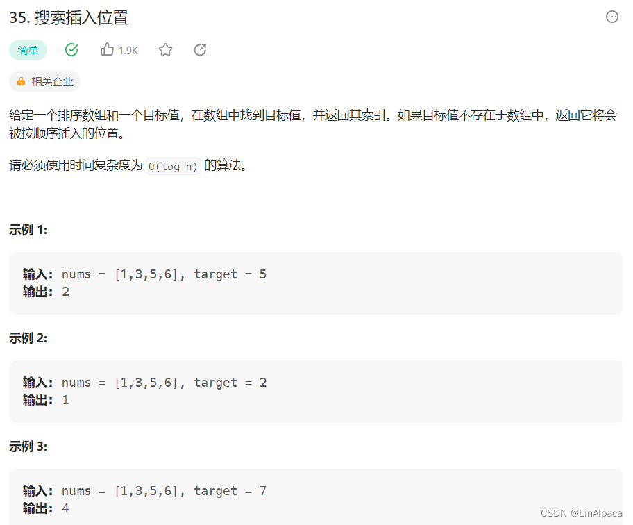 🥥这题难度相对简单,要我们在数组中找目标值,若找不到则返回目标值若插入到这个数组时的所在的下标。