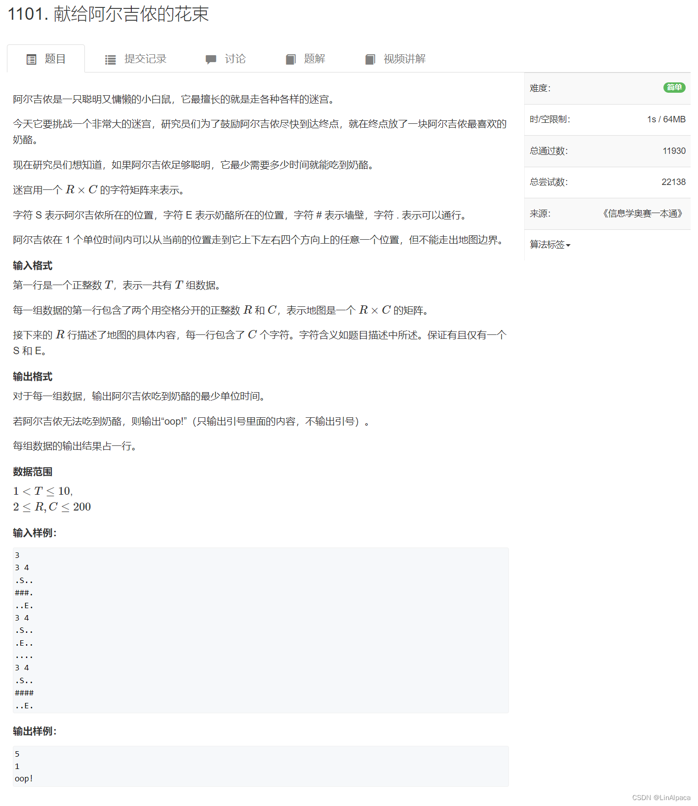 🍦根据题目所说,有一只小老鼠,从起点要去到终点,每步只能选上下左右走一步且不能穿越障碍物,要我们求从起点到终点的最短步数。 这就是典型使用bfs的经典场景。我们可以使用 bfs 遍历小鼠可能到达的位置,而当第一次到达终点时用的便是最短的步数。