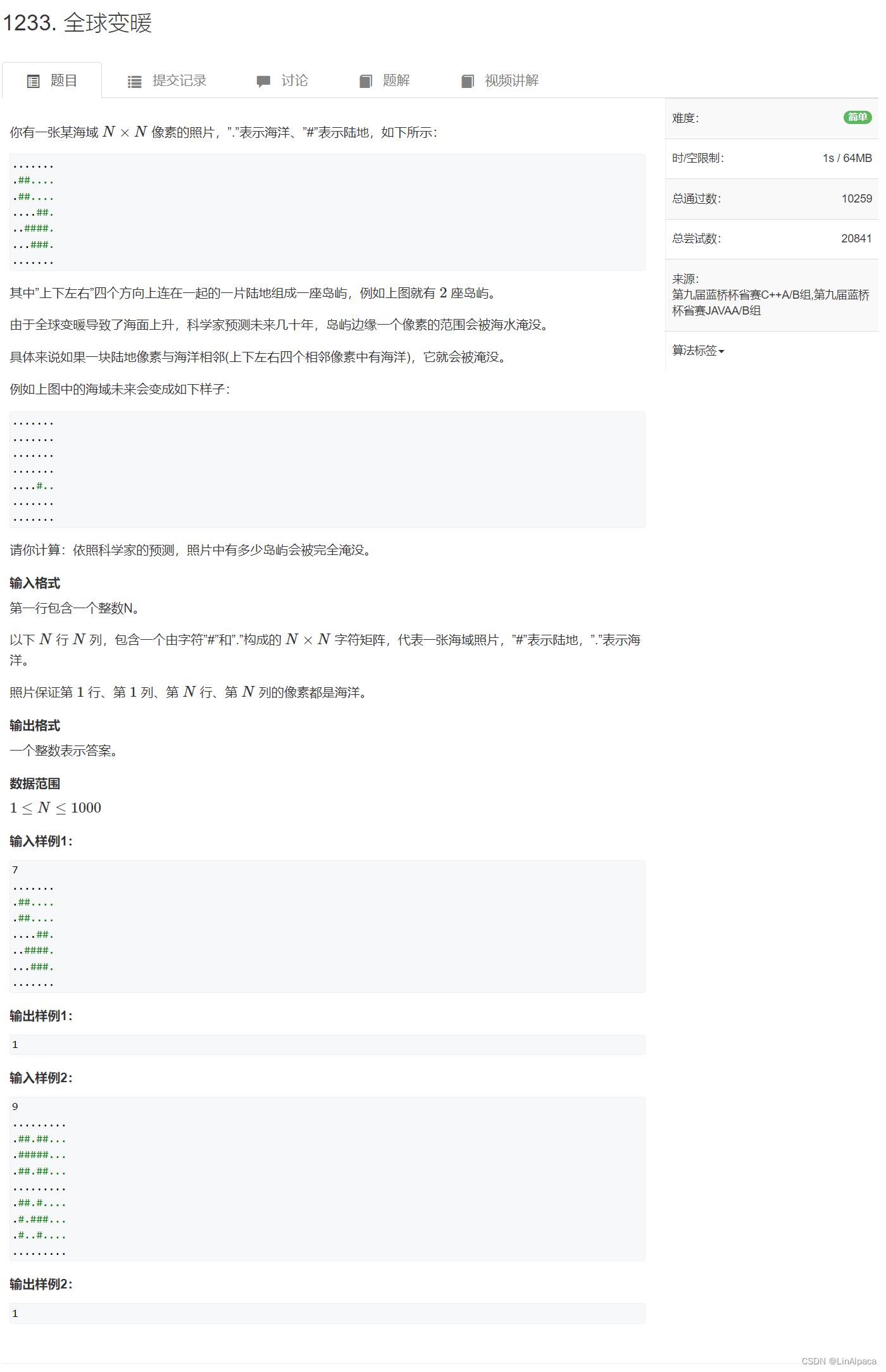 🍦题目给我们一片海域,海域中有几座小岛,随着几年过后海平面上升,只要上下左右一边靠海的陆地就会被淹没,题目需要我们计算会被淹没的岛屿有多少个?