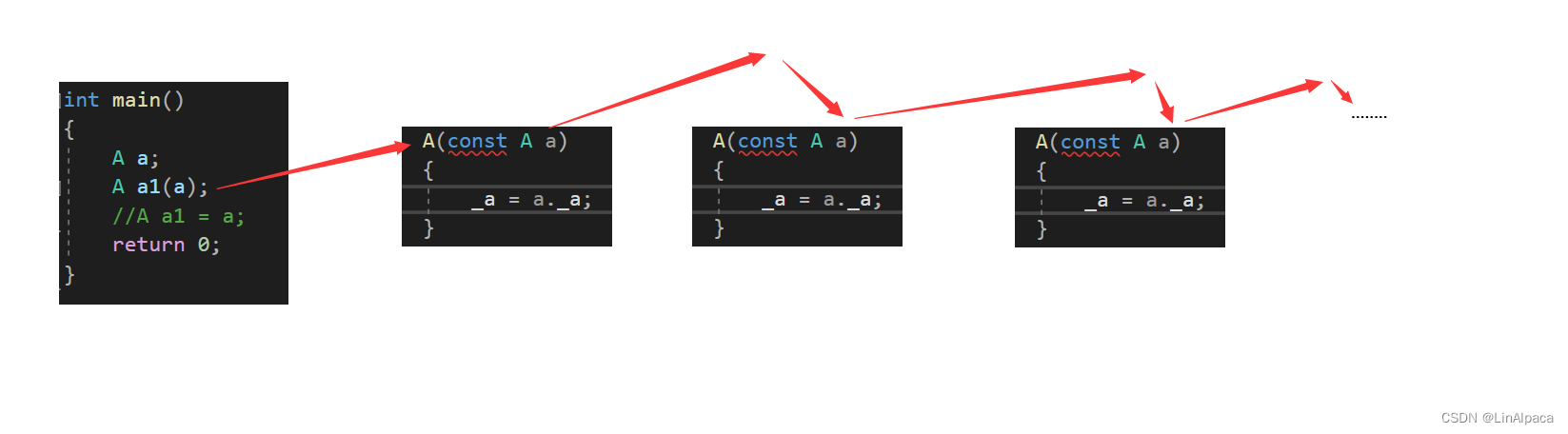 🧀我们都知道,在函数之中形参是实参的一份临时拷贝,当我们通过传值传参给拷贝构造函数时,系统会调用拷贝构造函数生成形参。因为又调用了拷贝构造函数所以又要生成形参,为了生成形参又要调用拷贝构造函数。如此反复就会产生无限递归的情况。因此,使用引用作为拷贝构造函数的参数就能够解决当前问题。因为引用就是原来对象的别名,因此不会再次调用拷贝构造函数。