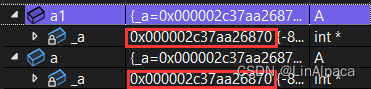 若运行上文的代码,系统便会崩溃报错, 这是为什么呢?通过调试我们能够观察到:两个类中的指针是一样的。这意味着在拷贝构造的时候,默认的拷贝构造只是将数值给了新构造类中的变量,并没有再次动态开辟内存,因此最后调用析构函数时,由于只开辟了一块空间却释放了两次,因此在free处报错。