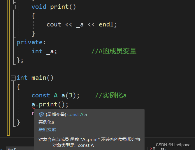 🧀例如我们此时有一个 const A 类型的对象,若我们直接调用我们的一个打印函数,编译器会报错,因为会出现权限放大。