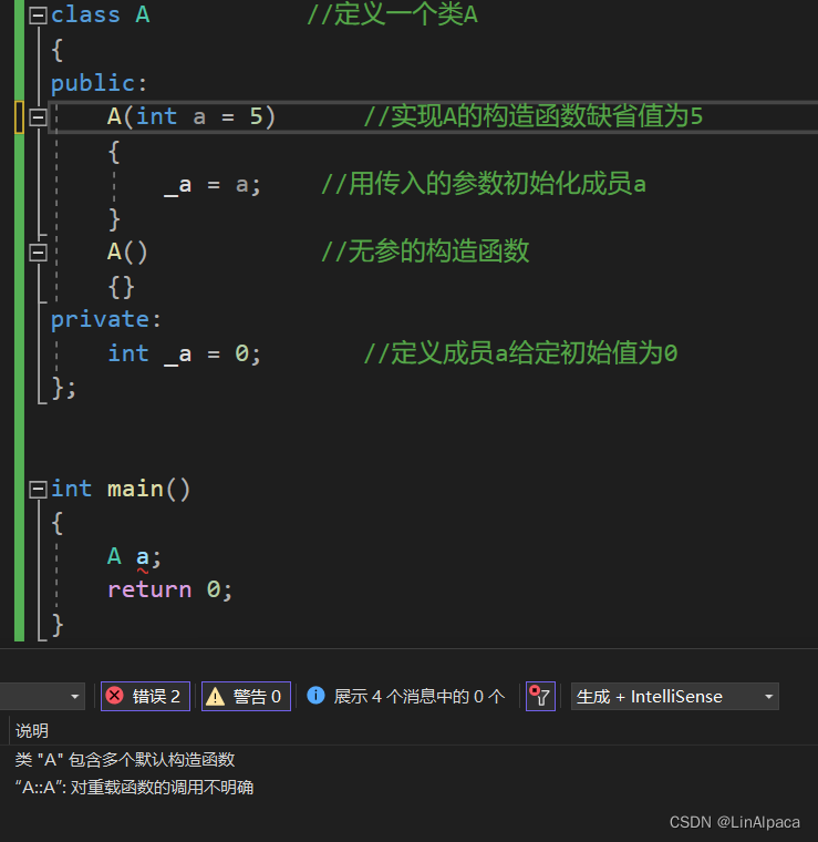 🧀无参的构造函数和全缺省的构造函数都称为默认构造函数,无参构造函数、全缺省构造函数、编译器默认生成的构造函数,都可以认为是默认构造函数。并且默认构造函数只能有一个,若全缺省和无参数的构造函数同时出现,则在无参实例化对象的时候出现歧义。因此二者不能同时出现。