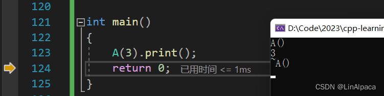 当我们调试到匿名对象的下一行语句时,该类的构造函数已经被调用了,即此时上一行的匿名对象已经被销毁了。