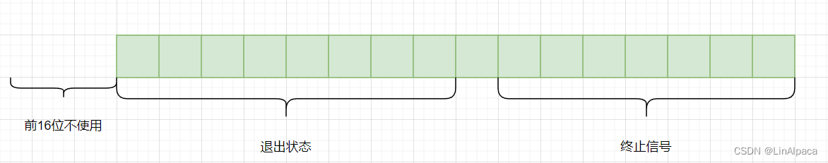 🧊放在位图之中,一个整型在 Linux 中一个整型是 4 字节,便有 32 个比特位,其中前十六位不使用,次低八位表示退出状态,最后七位表示终止信号。