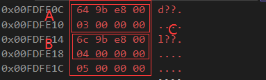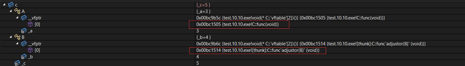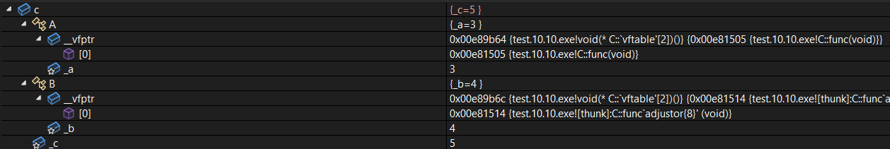 🧊首先前两行就是 C 中的 A 类数据,接下来两行便是 C 中的 B 类数据,最后便是 C 的成员变量。