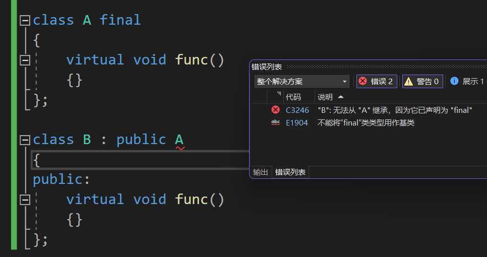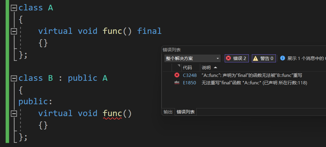 🧊其二则是加在虚函数后,这个虚函数便不能被重写,否则直接报错。