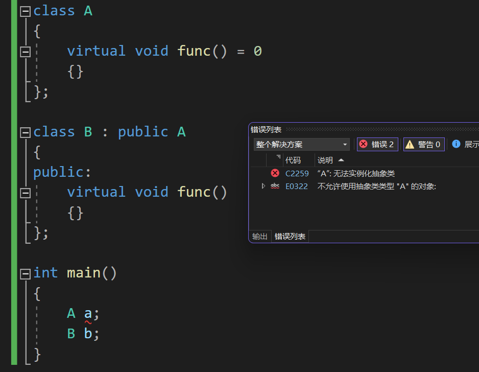 🧊在虚函数后加上 =0 便会将其定义成纯虚函数,而包含纯虚函数的类叫作抽象类,抽象类不能实例化出对象。