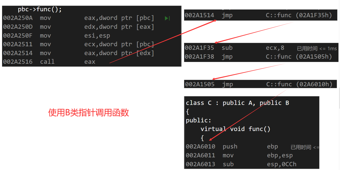 🧊因此,这个调用过程本质上是对 this 指针进行修正最后调用的还是第一个虚表中的函数指针。