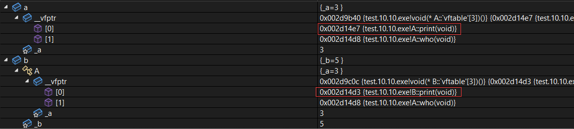 🧊与父类对象中的虚表进行对比后,我们可以看到在虚表中有重写的 print 函数覆盖了父类对应函数的指针,而未重写的 who 函数在虚表中仍是父类函数的指针。