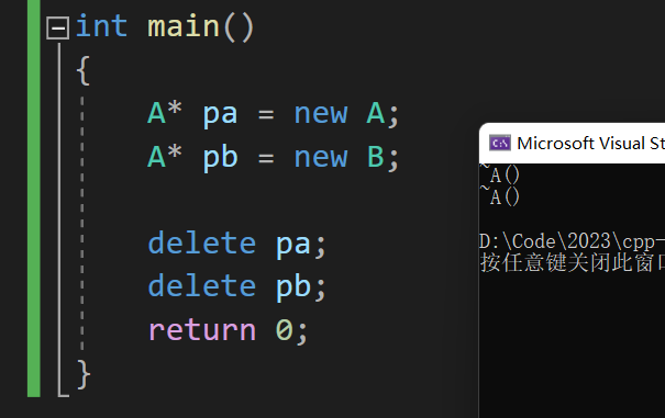 🧊在平时使用时,我们有时可能会使用父类的指针指向一个子类对象,若这个时候使用 delete 进行空间释放,便会根据数据类型进行函数调用,即两个空间都使用父类的析构函数进行释放,这显然是不合理的。