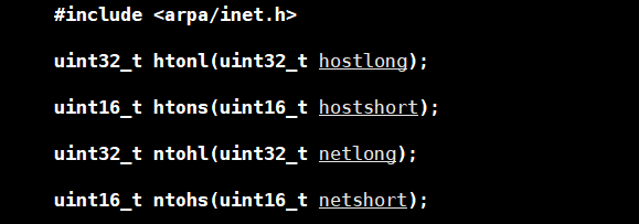 🌸对于整数的转换,有以下的接口,函数的名字和作用很好记,h 代表 host 即当前主机,n 代表 net 即网络序列,后面的 s 为 16 位整数,l 为 32 位整数。如 htons 就是将 16 位整数由当前主机序列转化为网络序列。