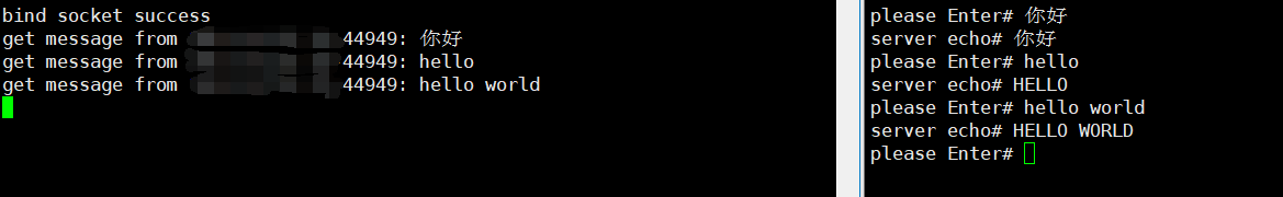 🌸将服务器和客户端运行起来,尝试向服务器发送信息,便成功收到其回应,同时当我们输入的信息有小写的字符时便会将其转换成大写。