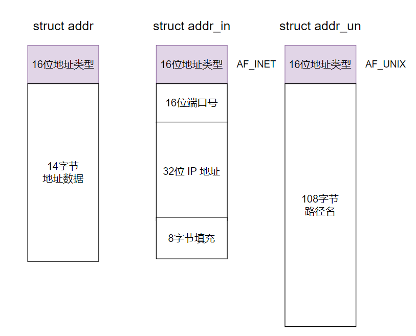 🌸sockaddr 这个结构就类似于使用C语言的方法简单实现了一个多态的处理方式,当头部的地址类型为 AF_INET 就以 struct addr_in 的方式解析结构体,若是 AF_UNIX 则使用 struct addr_un 的方式解析。