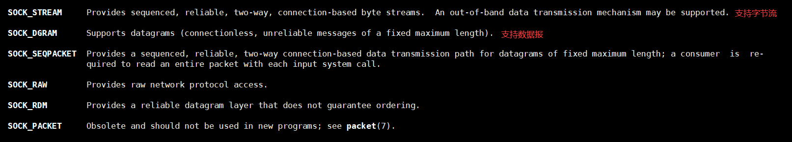 🌸其二的 type 参数用于指定通信语义,还记得我们上面讲的 TCP 是面向字节流的一种协议,而 UDP 则是面向数据报的一种协议,因此若是使用 TCP 协议直接使用 SOCK_STREAM 即可,而使用 UDP 则填入 SOCK_DGRAM。