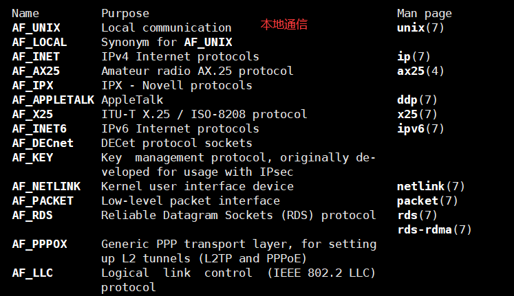 🌸其中第一个参数用于选择通信的协议族,有以下几种可以选择,一般我们进行网络通信填 AF_INET 即可。