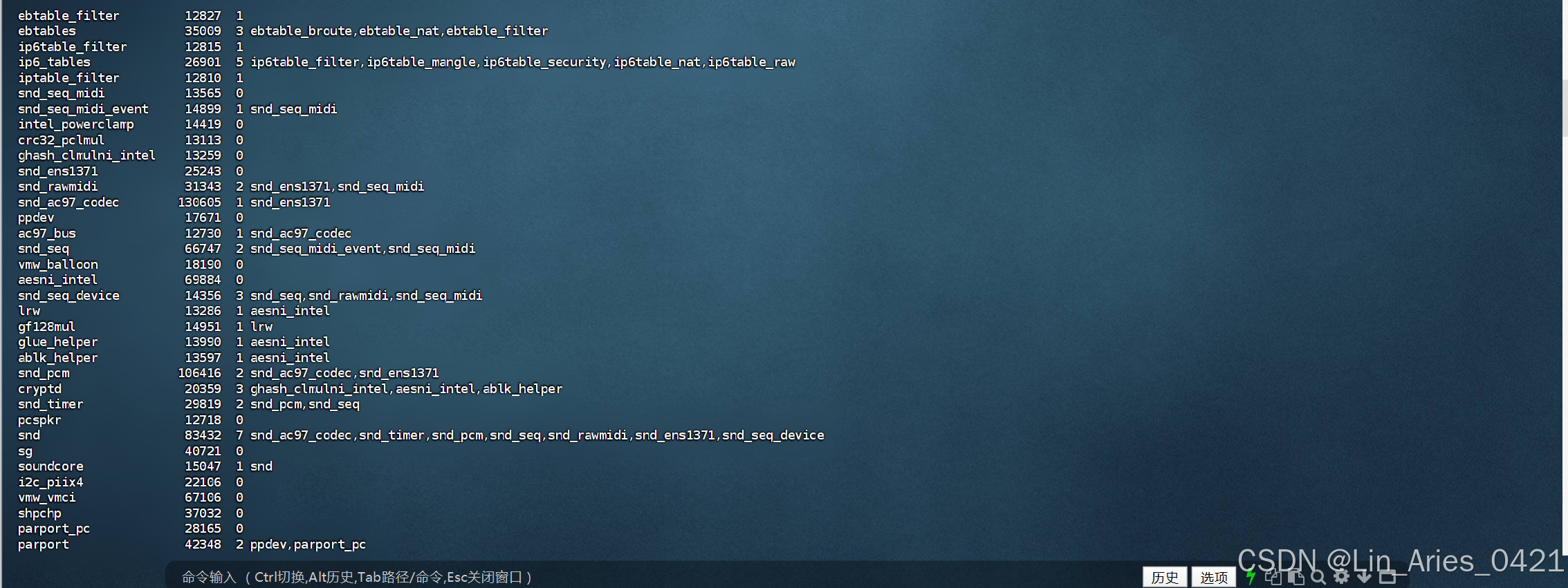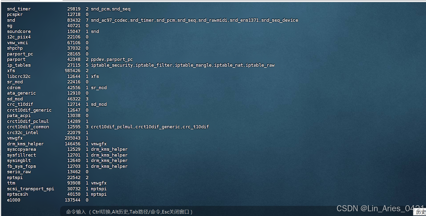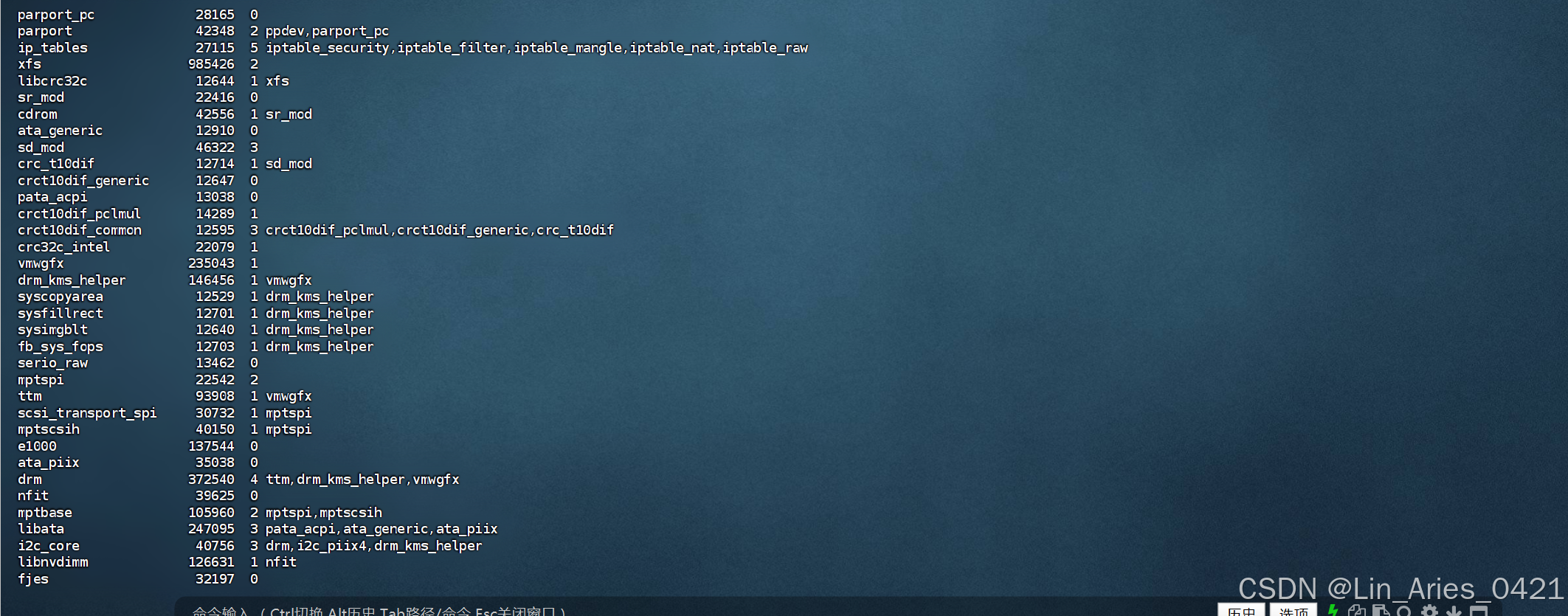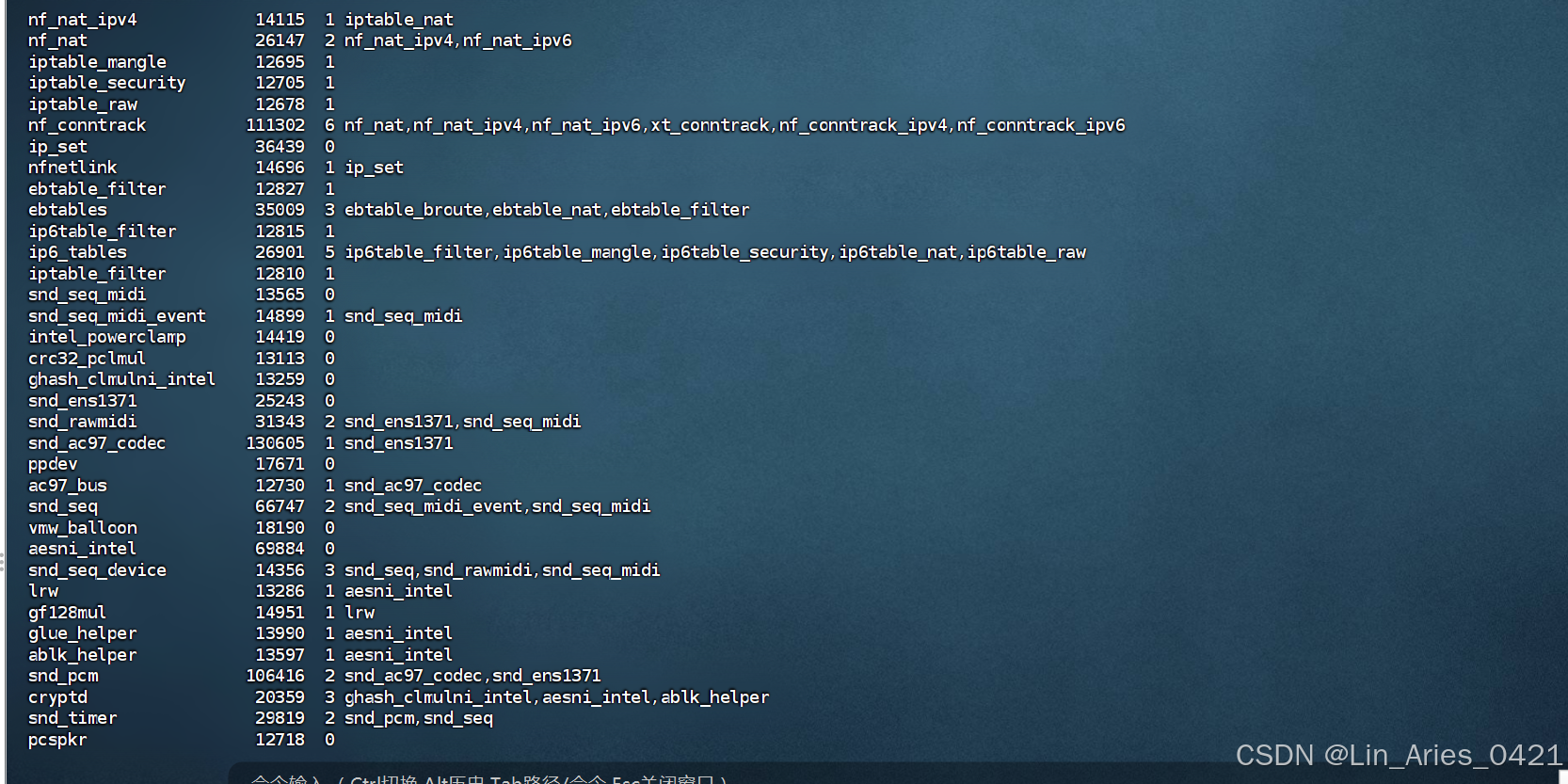 - 其中,第一列是模块名称,第二列是模块大小(单位为字节),第三列是该模块被其他模块或进程使用的次数。在这个例子中,