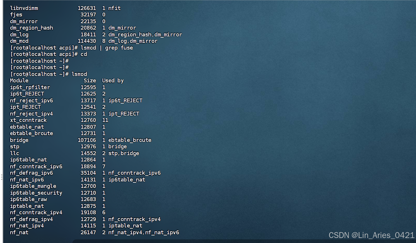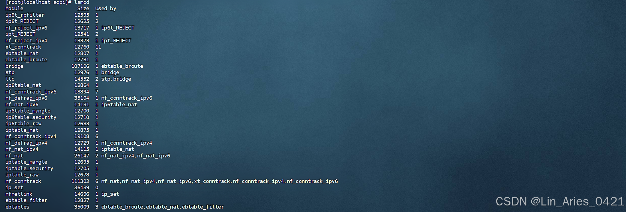 lsmod命令时,它会列出当前内核中已经加载的模块名称、大小以及被使用的次数等信息。例如:
