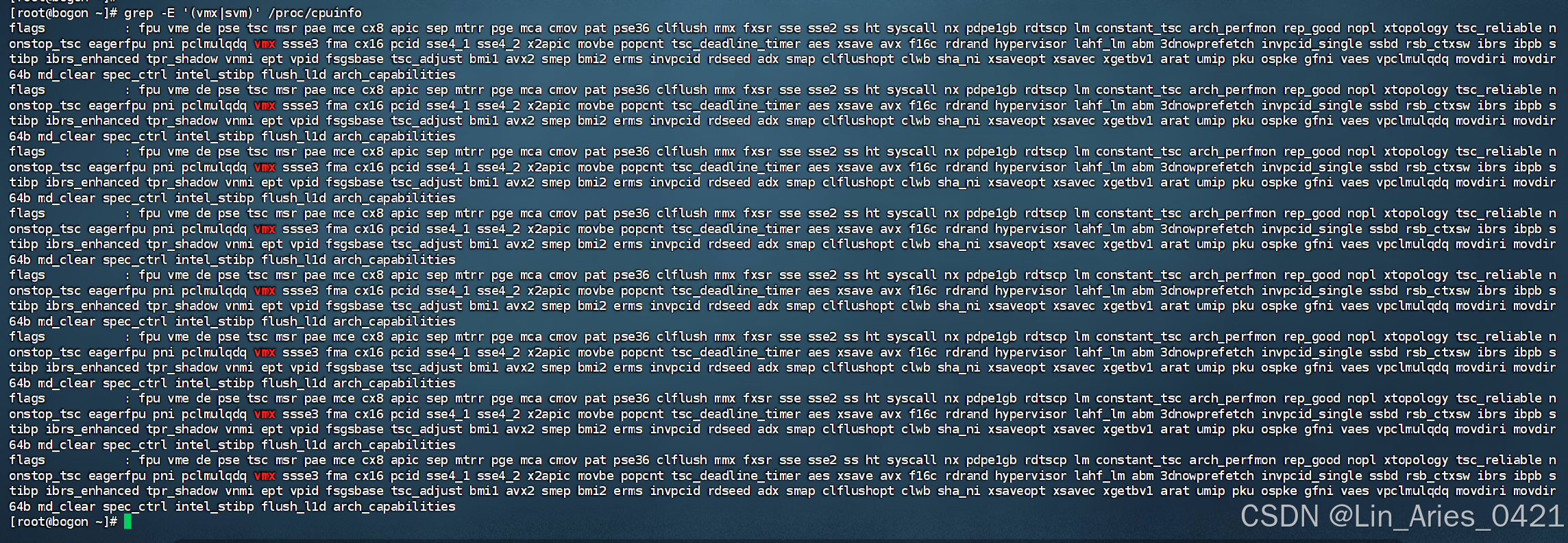 [root@bogon ~]# grep -E '(vmx|svm)' /proc/cpuinfo