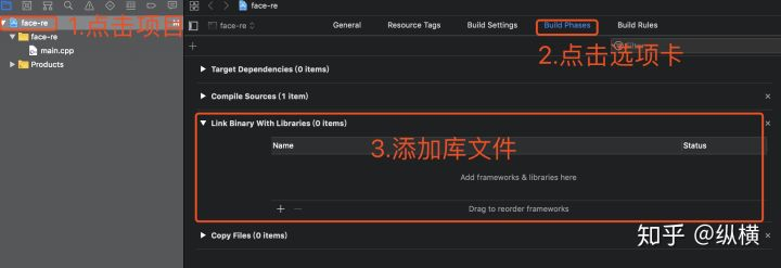 点击项目,选择 Build Phases 选项卡,添加库文件。