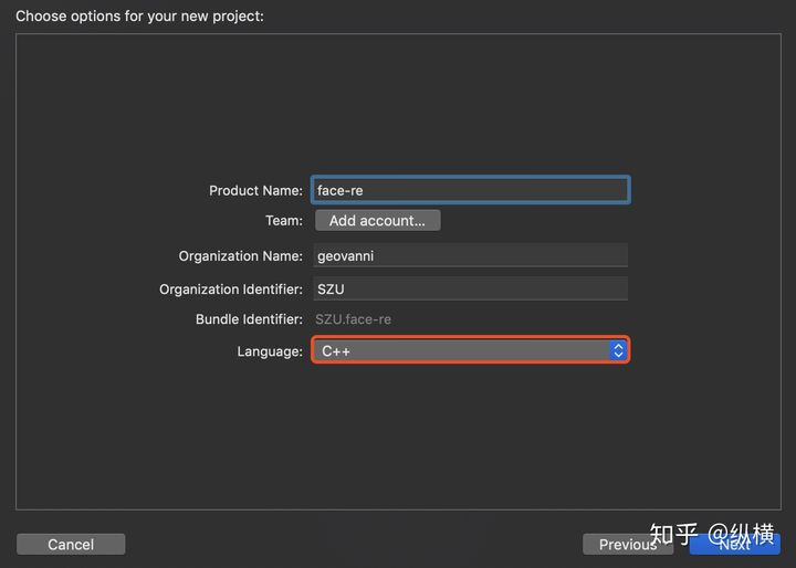 Xcode 默认推荐使用 swift,虽然我们可以用 swift 再去调用 C++,这里就简单一点,直接勾选 C++ 语言。