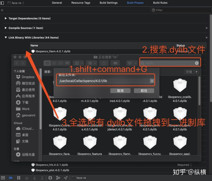 我们可以使用 Finder 找到 OpenCV 的二进制库文件。首先打开 Finder,按下 Shift + command + G,输入路径 /usr/local/Cellar/opencv/4.0.1/lib(这是 brew 安装 OpenCV 的默认地址,如果版本不一样可以找一下)并跳转(因为默认这些目录是不显示的,只能用这种方法啦)。最后,搜索文件夹下的所有 .dylib 文件,拖入 xcode 的二进制库选项卡~