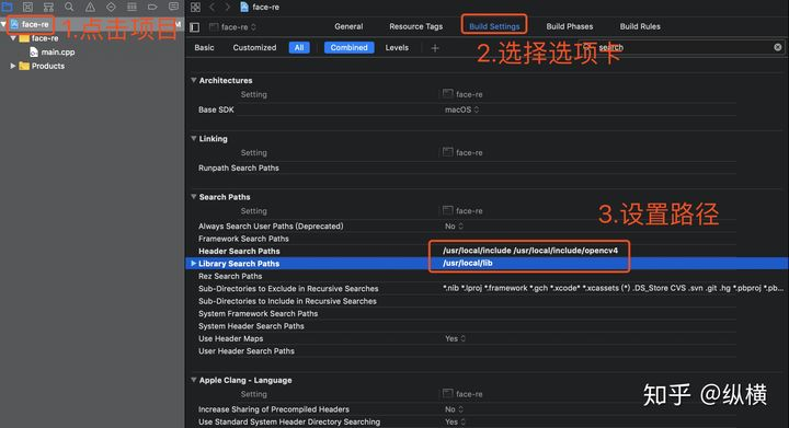 点击项目,选择 Build Settings 选项卡,使用搜索框搜索 search,修改 Header Search Paths 和 Library Search Path。这样,Xcode 在编译 C++ 文件时,如果找不到头文件或者库文件就会去我们设置的目录下索引。