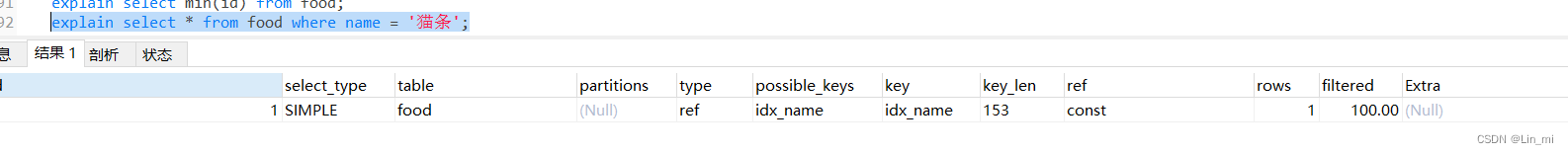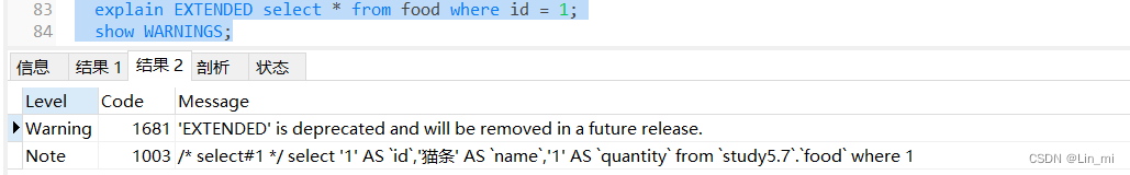 1) Explain extended:会在Explain的基础上额外提供一些查询优化的信息。紧随其后通过show warning命令可以得到优化后的查询语句,从而看出优化器优化了什么,额外还有filtered列,是一个半分比的值,rows * filtered/100 可以估算出将要和explain中前一个表进行链接的行数(前一个指explain中的id值比当前表id值小的表)