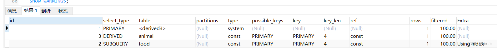 当from子句中有子查询时,table列是<derivenN>格式,表示当前查询依赖id=N的查询,于是先执行id=N的查询。
