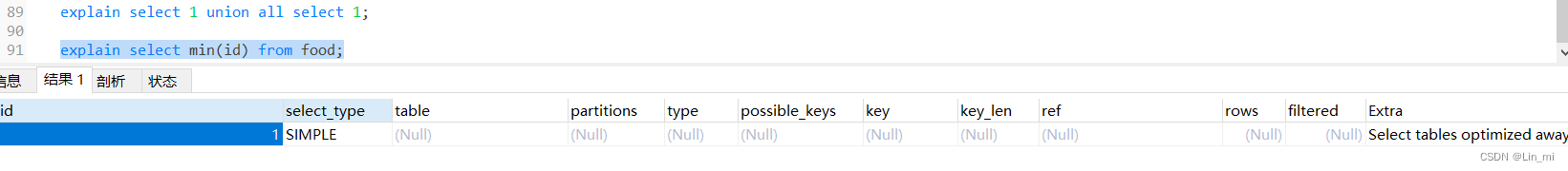 mysql能够在优化阶段分解查询语句,在执行阶段用不着再访问表或索引。例如:在索引列中选取最小值,可以单独查找索引来完成,不需要在执行时访问表。