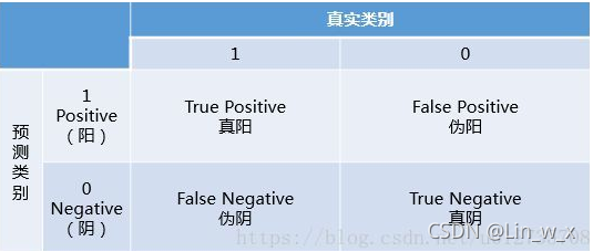 称预测类别为1的为Positive(阳性),预测类别为0的为Negative(阴性)。 预测正确的为True(真),预测错误的为False(伪)。 对上述概念进行组合,就产生了如下的混淆矩阵: